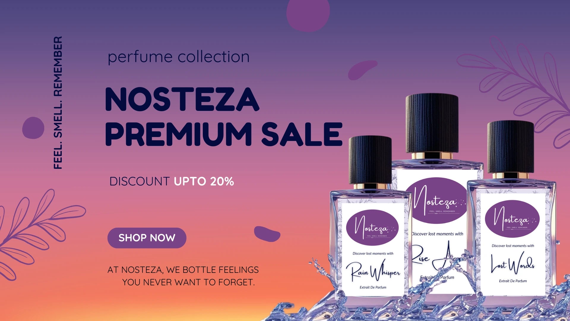 Nosteza is more than a perfume — it is a statement of style and confidence. Designed in Pakistan with premium ingredients, our long-lasting fragrances bring the luxury of fine perfumery to everyday life. Whether bold and masculine or soft and feminine, each scent is crafted to leave an unforgettable impression.